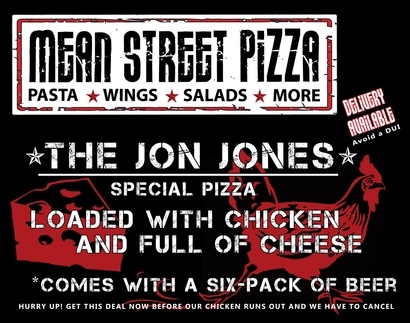 В своем заведении Чаел Соннен стал предлагать блюдо под названием «The Jon Jones Spezial Pizza». В этой пицце полно сыра, и она, вы только подумайте, имеет начинку из цыпленка. А чтобы тонкий намек был понятен всем, Соннен указывает, что данное предложение ограничено по времени по причине того, что цыпленок может убежать.
