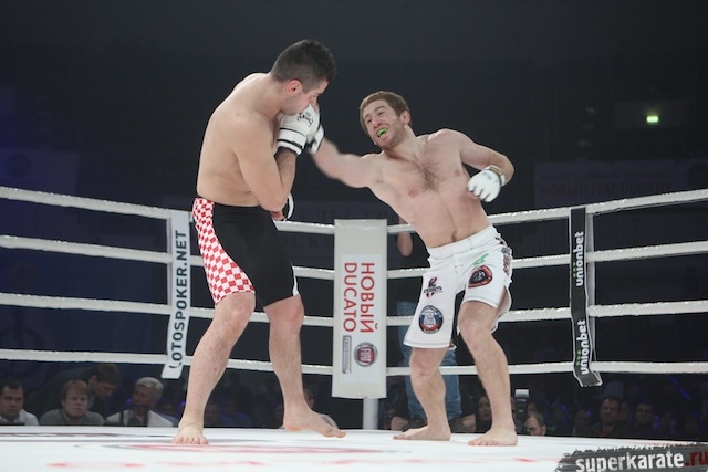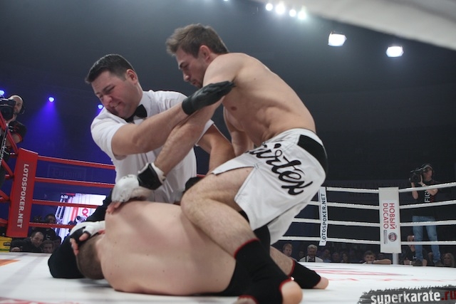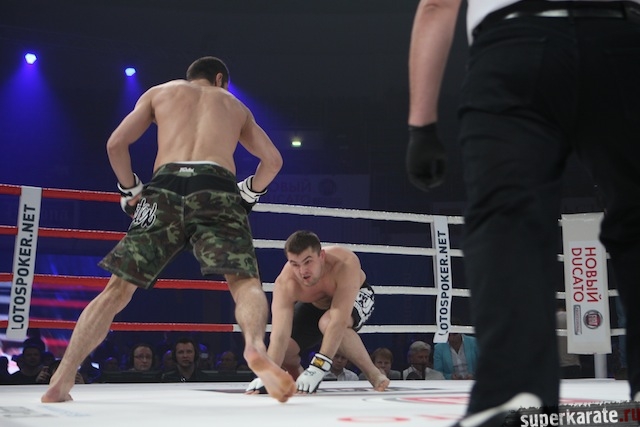 В следующем поединке, также по правилам ММА, встретились Константин Ерохин (Россия) и Джермен ван Рой (Голландия). В принципе, здесь все понятно. Голландец должен был стать для Ерохина очередной хорошей проверкой на пути продвижения этого мощного атлета в элиту бойцов тяжелого веса. Ерохин эту проверку выдержал. Но остались вопросы. Даже за тот небольшой промежуток времени, который бойцы находились на ринге, голландец, больше заряженный на поединок в партере, сумел сделать Ерохину серьезное рассечение. Все-таки желание быстро разобраться с оппонентом берет верх над осторожностью. К тому же есть ощущение, что Константин перегружен мышечной массой, которая, если, например, случится долгий позиционный бой, может сыграть злую шутку. Ерохин победил нокаутом и разочаровал многих тем, что слишком быстро все закончилось.