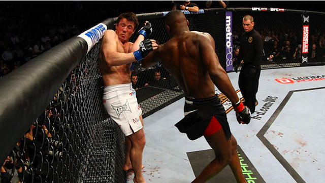 Сгорая от нетерпения как можно быстрее наказать не в меру говорливого, напичканного тестостероном Соннена, Джонс на первых же секундах первого раунда прошел в захват и перевел соперника в партер, где стал его хорошенько обрабатывать. Соннену удалось вывернуться и вернуться в стойку. Но это не помогло.