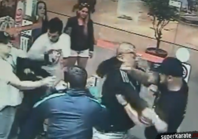 Драка началась в магазинчике на заправке и первое время бойцы ММА вполне справлялись со своими оппонентами. Но как только мордобой перешел на улицу, то в воздухе засвистели палки...