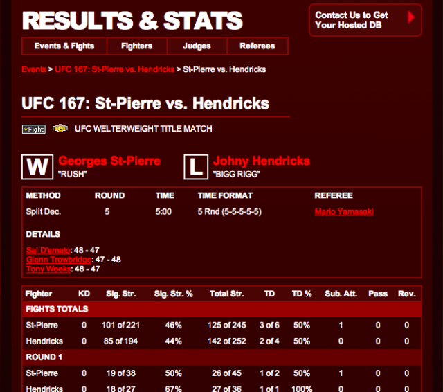 Упрямая статистика также утверждает, что Джони Хендрикс доставил немало беспокойства Сен-Пьеру – 85 ощутимых ударов пришлось на долю чемпиона. Хендрикс получил даже больше, но кто при этом выглядел и чувствовал себя хуже..? Любители цифр не поленились и выяснили, что эти 85 страйков на UFC 167 – максимальное число пропущенных ударов по сравнению с любым другим поединком Сен-Пьера в промоушене...