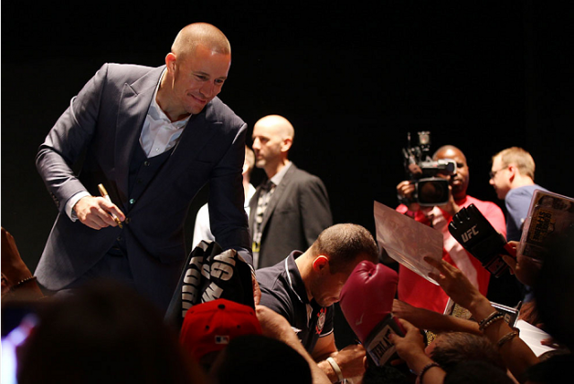 Президент UFC Дана Уайт в недавнем интервью SportsNet прокомментировал информацию о предстоящей пресс-конференции Джорджа Сен-Пьера. По словам Уайта, это будет классическая автограф-сессия чемпиона, на которой 10 минут будет отведено общению с представителями СМИ.Данное мероприятие было запланировано задолго до объявления Сен-Пьера об уходе в «творческий отпуск» после UFC 167. «Эта встреча была внесена в промо-график несколько месяцев назад – он примет участие в открытии торгового центра и проведет небольшую автограф-сессию для фанатов… Я не отрицаю, что у него могут найтись какие-то новости по поводу планов на будущее… Однако, он не сумасшедший, чтобы заявить об уходе, как думают некоторые», сообщил Уайт.