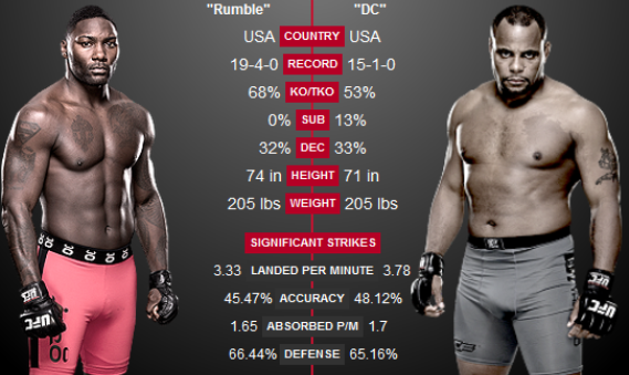 Anthony Johnson vs. Daniel Cormier (for vacant light-heavyweight title)- Cormier wins via submission at 2:39 of round 3