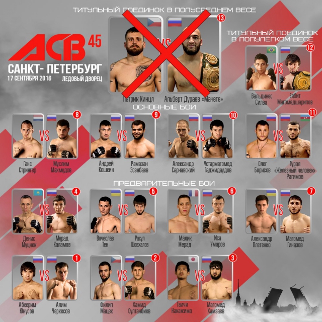 Титульный поединок между Патриком Кинцлом и Альбертом Дураевым был отменён, потому как по итогам взвешивания вес Альберта Дураева составил 83.0, а Патрика 77.6.