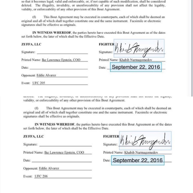 А сегодня Хабиб Нурмагомедов сообщил, что имеет на руках два контракта на бой с Альваресом, которые он уже подписал. В подтверждение своих слов, Хабиб опубликовал в Instagram фотографии документов.