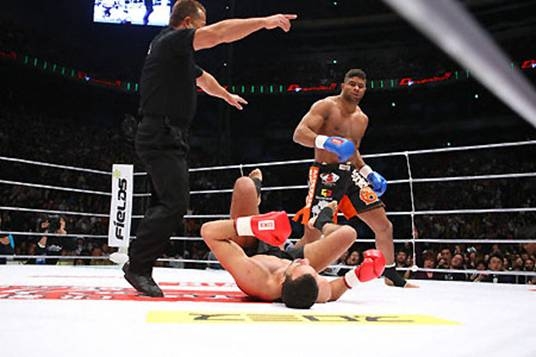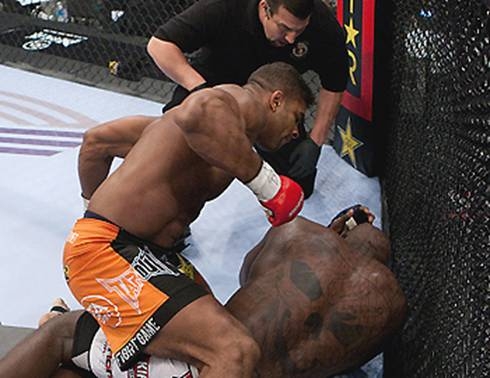 Возможно, все бы так и случилось, но, видимо, об этих планах и статистиках ничего не сказали Алистару. Грамотно отработав, не давая своему противнику на протяжении всего боя в полной мере использовать удары руками, он во второй половине второго раунда прижимает Буэнтелло в тайском клинче к решетке октагона и наносит сильнейший удар коленом по корпусу, от которого бывший фаворит, будучи не в состоянии оправиться, валится на землю; рефери вынужден остановить бой.