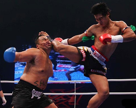 Именно этот тайский боец, имевший в то время вес 75 кг, на этапе Гран-При К-1 2005 ударом ногой в прыжке послал в нокаут 130-ти килограммового Майти Мо (США).