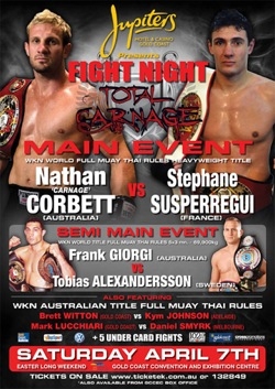 7 апреля в Австралии состоялся первый турнир серии "Total Carnage". Главным поединком этого события стал бой за титул чемпиона мира по тайскому боксу по версии WKN в весовой категории до 95 кг, в котором Натан Корбет (Австралия) встречался со Стефаном Сусперрегуи (Франция).