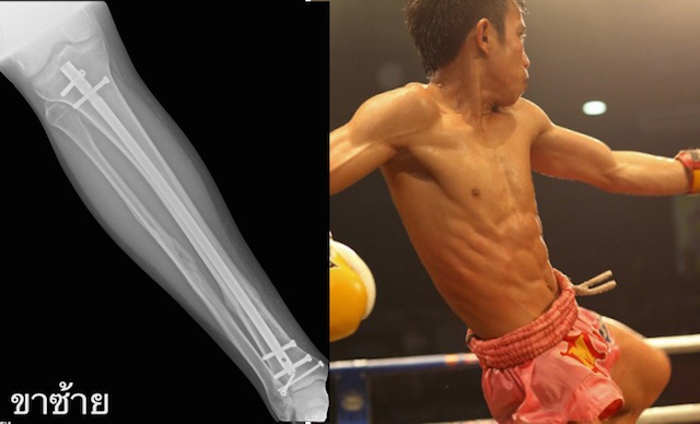 Это как раз то, что вы могли бы видеть в каком-нибудь боевике. Злодей с титановой ногой. Согласно имеющейся информации, Всемирный Совет Муай Тай (WMC) дисквалифицировал бойца за то, что он несанкционированно вышел на поединок имея в ноге титановый имплант.