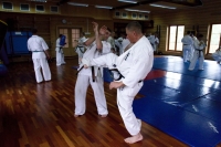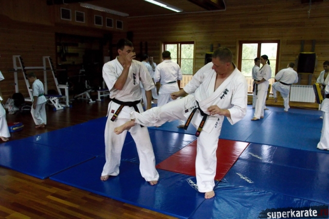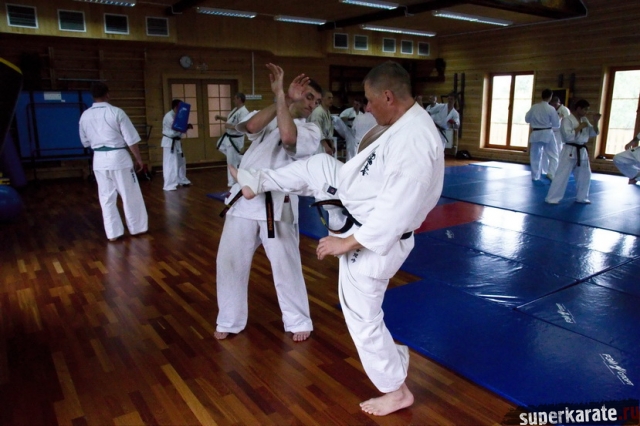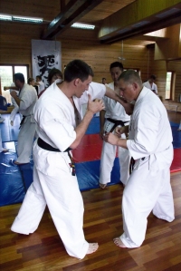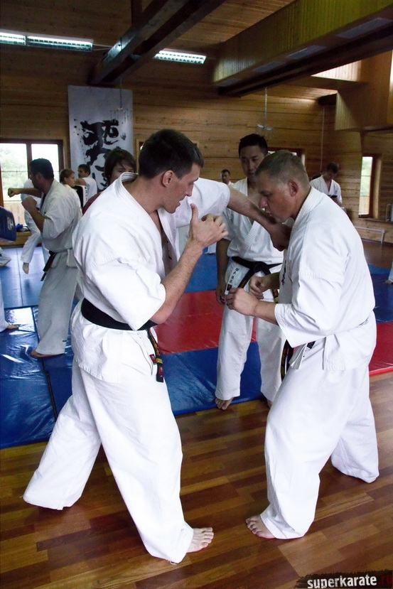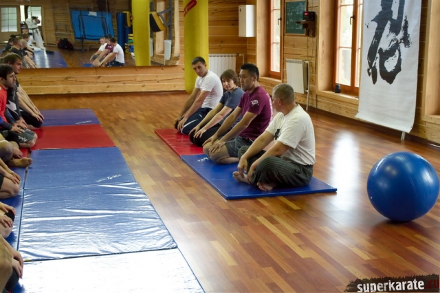 Разминка – кихон – идо кихон. Сэнсей много времени уделяет разминке каждого сустава, особенно нижнего позвоночного отдела и таза. Этому даже было отведено отдельное время. Кихона и идо может показаться недостаточно, но тренировки проходили в режиме именно семинара, поэтому особое внимание отводилось 3 части – «Цукамото стайл», если можно так выразиться.