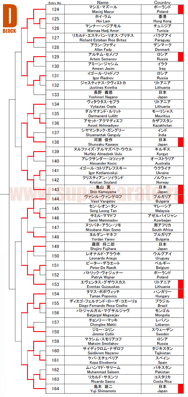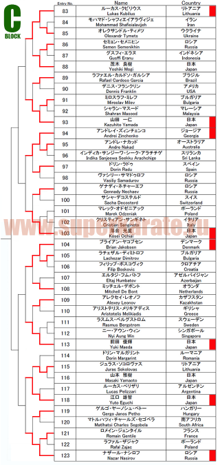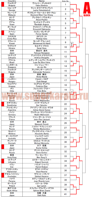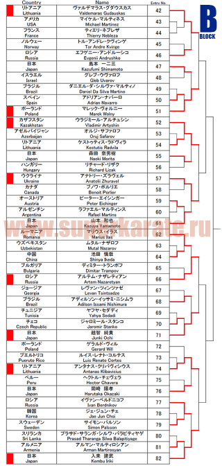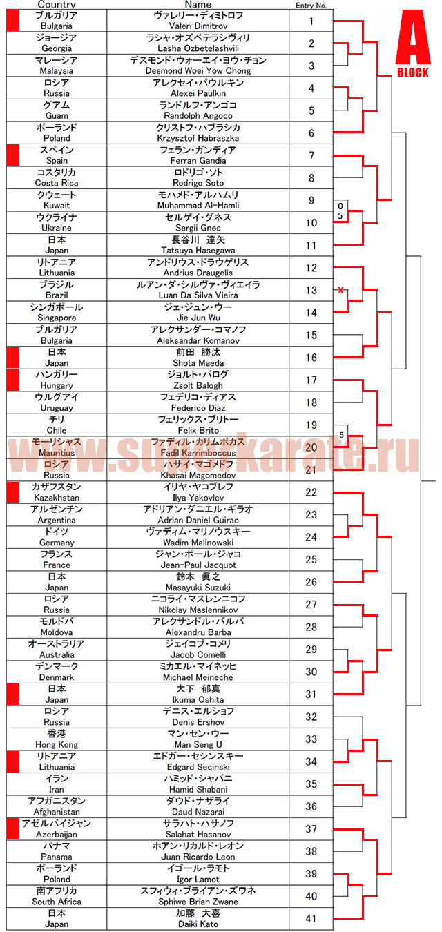 Предлагаем вашему вниманию проведенные пули первого дня 11 абсолютного Чемпионата мира по шинкиокушинкай. Для удобства пули поделены на 4 Блока - A, B, C, D. Те бойцы, которые вышли во второй день чемпионата имеют в пуле дополнительную красную отметку.