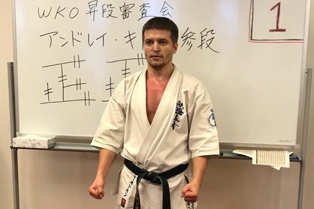 Я готовился к дан тесту в Красноярске, подготовку начал за два с половиной месяца. Экзамен прошёл в принципе в традиционной форме, но в то же время были некоторые отличия. Например, было несколько пауз для того, чтобы посмотреть более досконально технику и ката у коричневых поясов и первых данов, у вторых данов и выше.