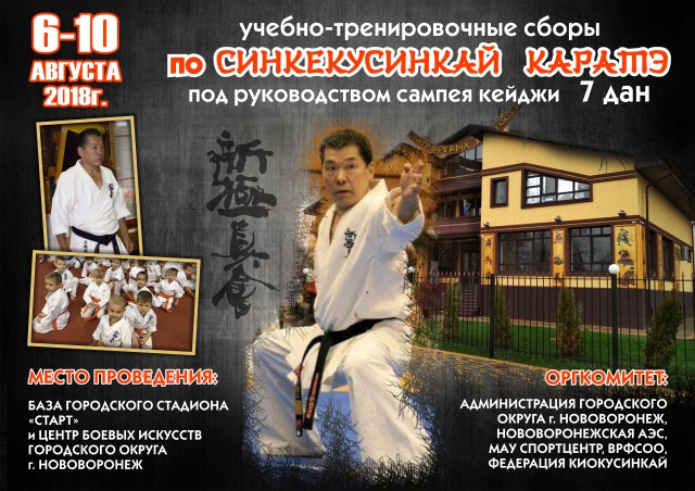 6-10 августа 2018 года на спортивной базе городского стадиона «Старт» и в Центре Боевых Искусств городского округа г.Нововоронеж пройдут международные учебно-тренировочные сборы по Синкёкусинкай под руководством Кейджи Сампей - 7 дан.