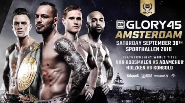 Объявлена полная карта боёв турнира по профессиональному кикбоксингу GLORY 45, который состоится 30 сентября, в субботу, в Амстердаме (Голландия). Хэдлайнерами этого мероприятия станут Робин Ван Русмален, который будет защищать титул чемпиона мира в полулегком весе в поединке против Сергея Адамчука, а также Ники Хольцкен, который в рамках полусреднего веса сразится с Йоанном Конголо.
